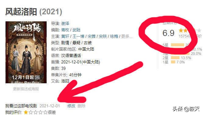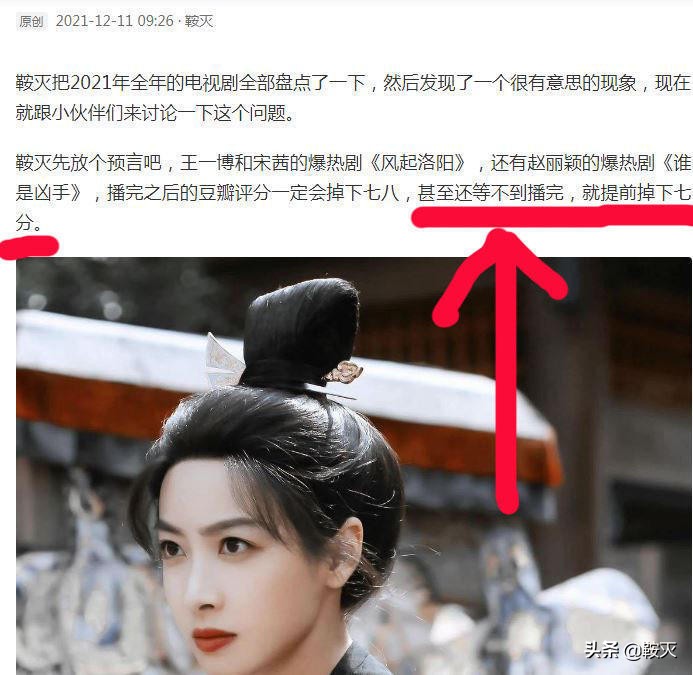 而且,鞍灭还在12月11日的影评文章中做出了预言,说王一博的《风起洛阳》和赵丽颖的《谁是凶手》,最终的评分都会掉下七分。