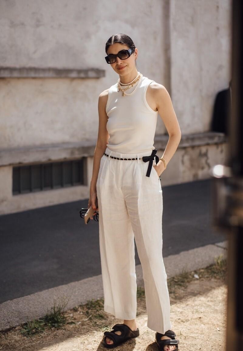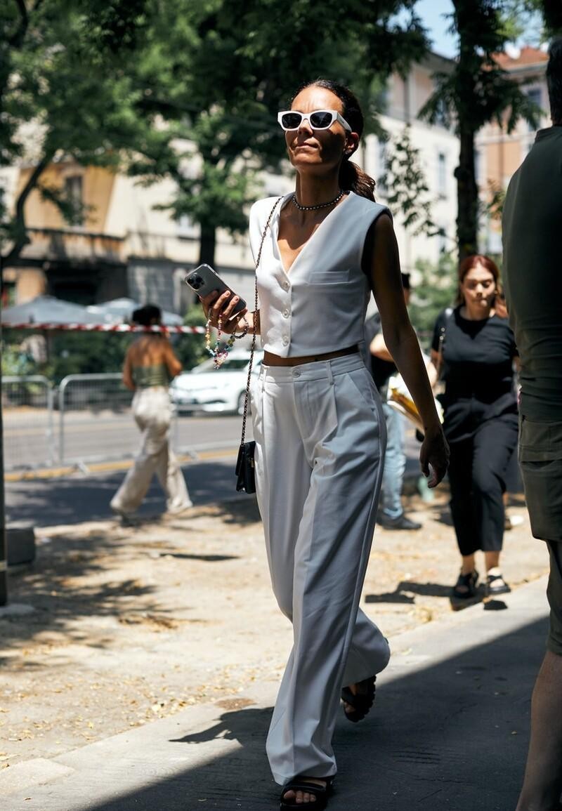 吊带上衣也建议选择白色的款式,白色吊带上衣搭配白色阔腿裤的话,就不会让造型因为性感过头而变得俗气,反而是一种高级的穿搭造型。