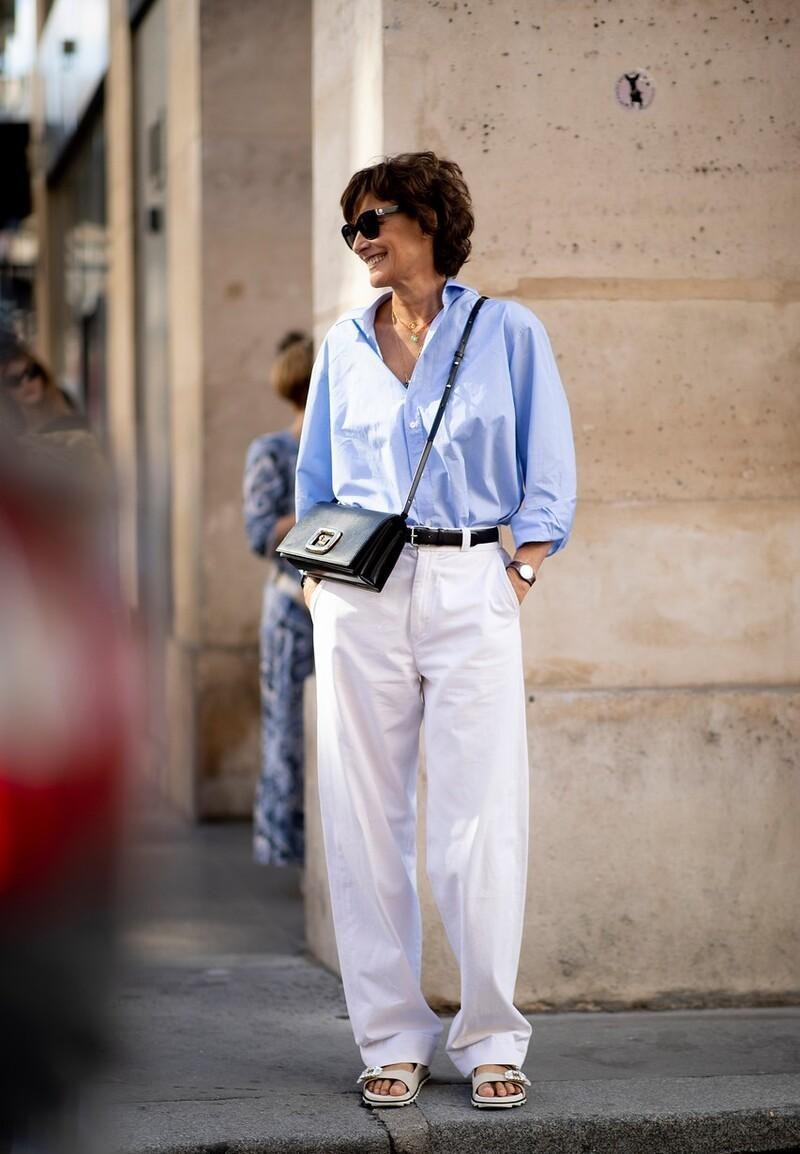 白色阔腿裤+蓝色衬衫