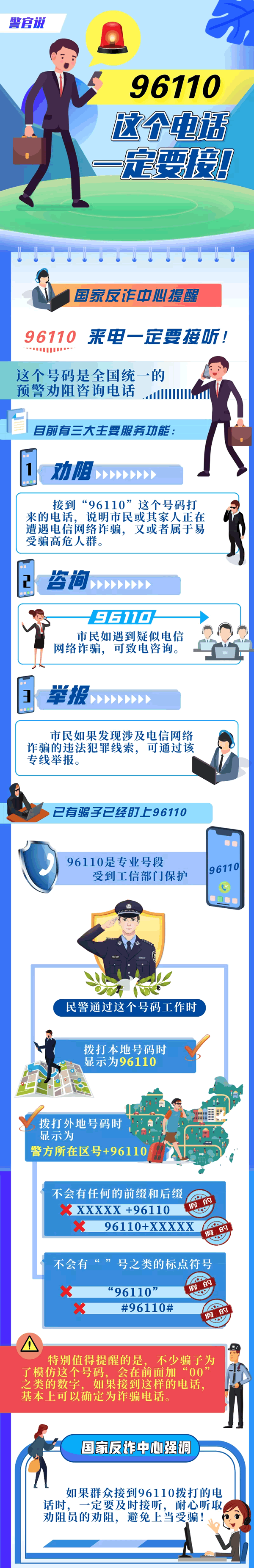 来电显示为“96110”或“属地区号+96110”,除了加区号,不会有任何其他前缀、后缀,以及标点符号。请大家注意甄别!