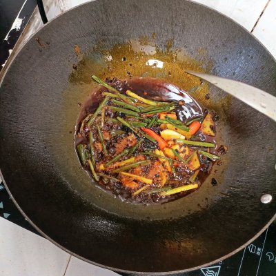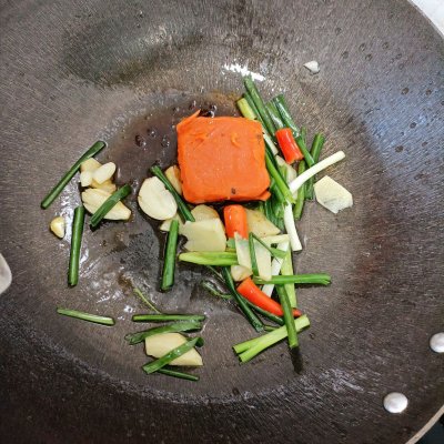 2、2⃣把火锅底料翻炒融化。