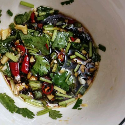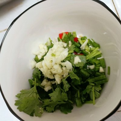 4、4⃣调料葱,蒜,香菜,辣椒切碎倒入碗中。