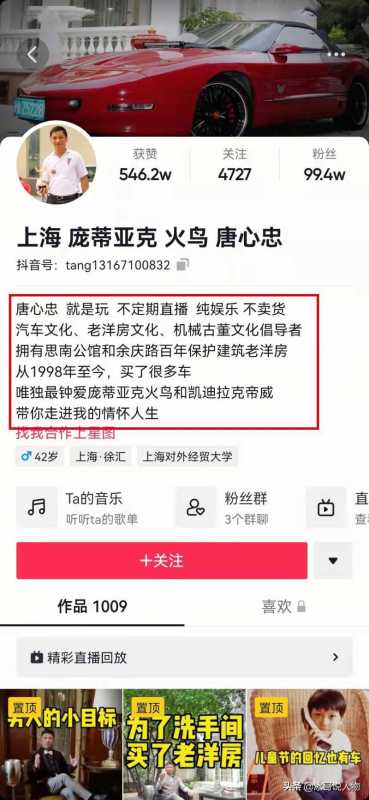 唐心忠网名叫:上海庞蒂亚克火鸟唐心忠,他主要分享的就是老洋房文化、汽车文化,正如他的抖音个人介绍:“”唐心忠,就是玩,不定期直播,纯娱乐,不卖货,汽车文化、老洋房文化、机械古董文化倡导者,拥有思南公馆和余庆路百年保护建筑老洋房,从1998年至今,买了很多车,唯独最钟爱庞蒂亚克火鸟和凯迪拉克帝威,带你走进我的情怀人生……”