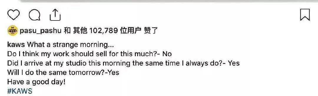 我来翻译一下,Kaws:这真是一个奇怪的早晨啊。我认为我的作品值这么多钱吗?不。我今天像往常一样在一大早就到工作室了吗?是的。我明天还是这样吗?是的。祝大家都好。