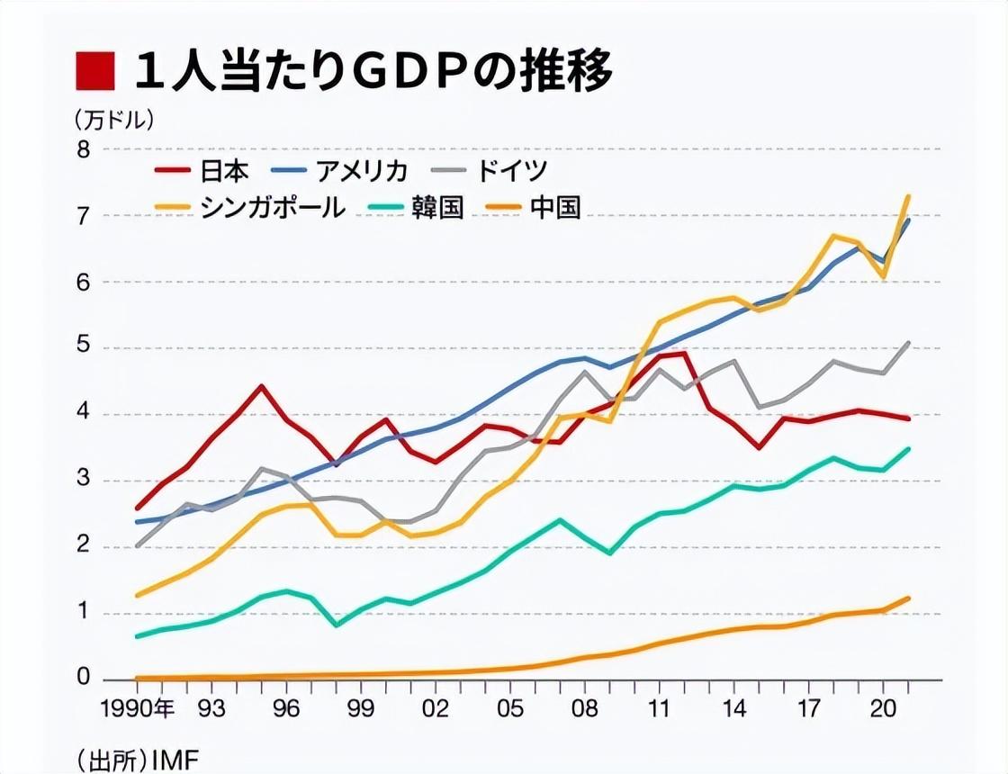 文章使用图表将日本和主要国家的人均GDP比较显示了日本、美国、中国、德国、新加坡和韩国 1990 年到 2021 年的人均 GDP变化。