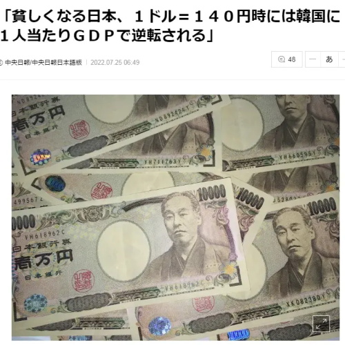 日元贬值导致了‘日本比韩国穷’的惊人事实。日本《东洋经济》周四发表了一篇文章,称由于日元大幅贬值,日本人均GDP它将低于韩国,不到美国的一半。日本、美国和韩国的工资差距也在扩大。这些不仅仅是数字上的变化,说明日本人其实已经变穷了,日本的工业也被削弱了。