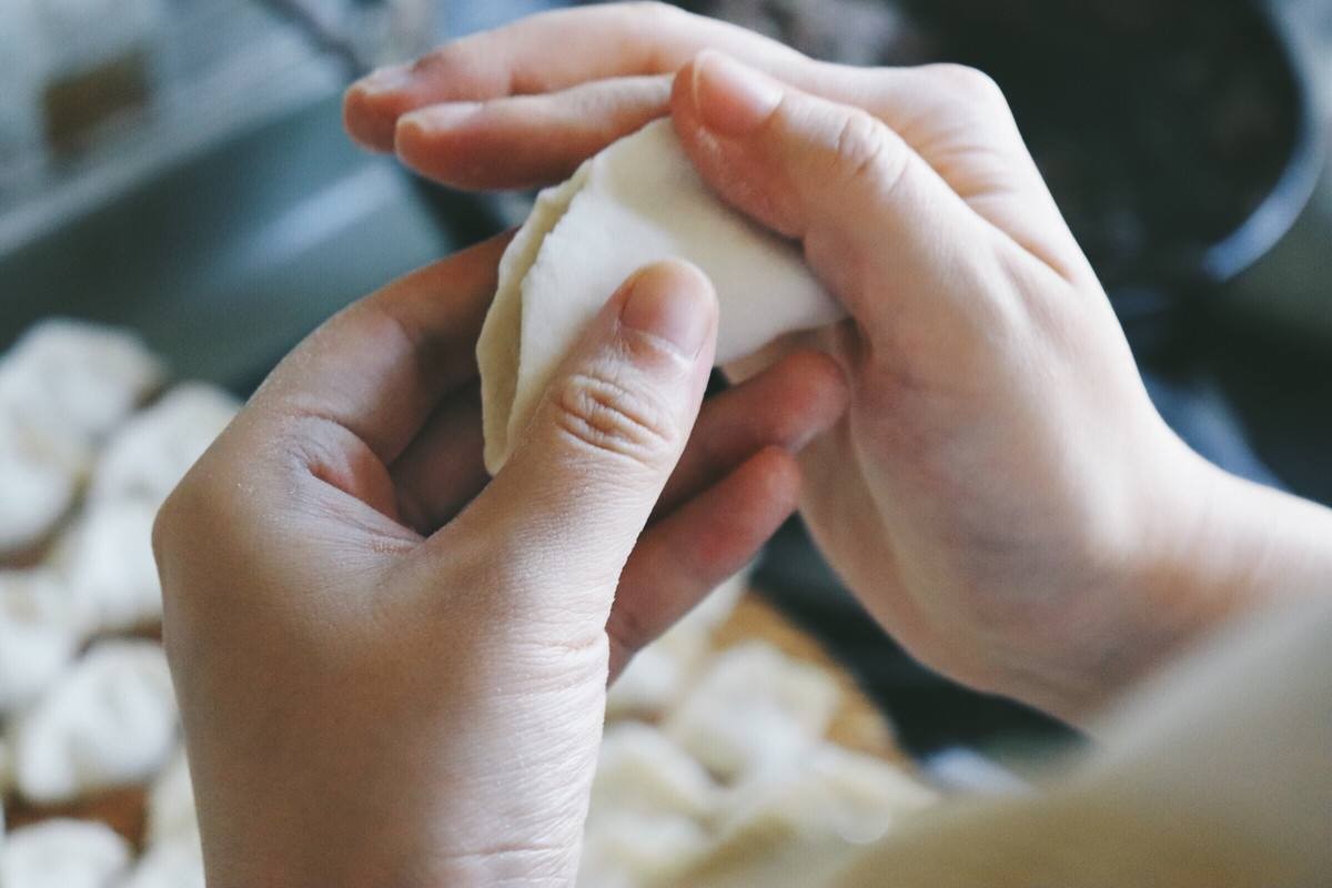 3、用筷子把馅料挖到饺子皮上,从中间捏一下,然后顺着整个饺子边缘全部捏紧,一定要注意没有缝隙,这样煮饺子的时候才不会露馅。