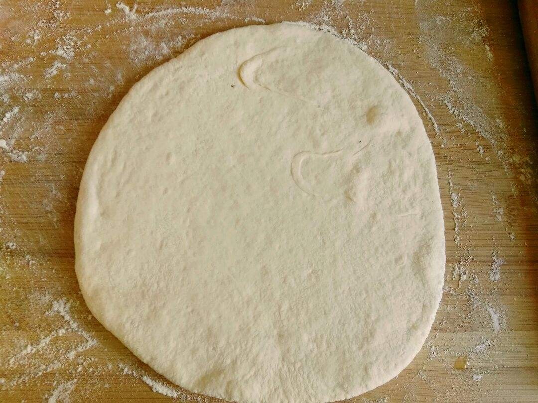 3、开始准备花卷,一小碗面粉(大约三百克)加入180毫升的水,少量多次的加入,然后揉成一个面团,醒发至两倍大,之后再揉一揉排排气,摊开成一个面饼状,不会整个和面摊饼的朋友,可以把面团分成小剂子再摊开。