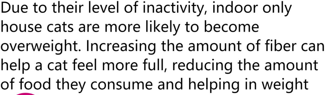 大多数猫实际上是室内猫,纤维也有助于饱腹感,不要让猫吃太多,吃多了也可能导致肠胃问题
