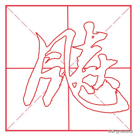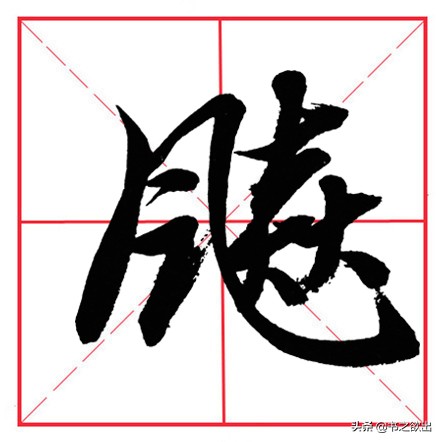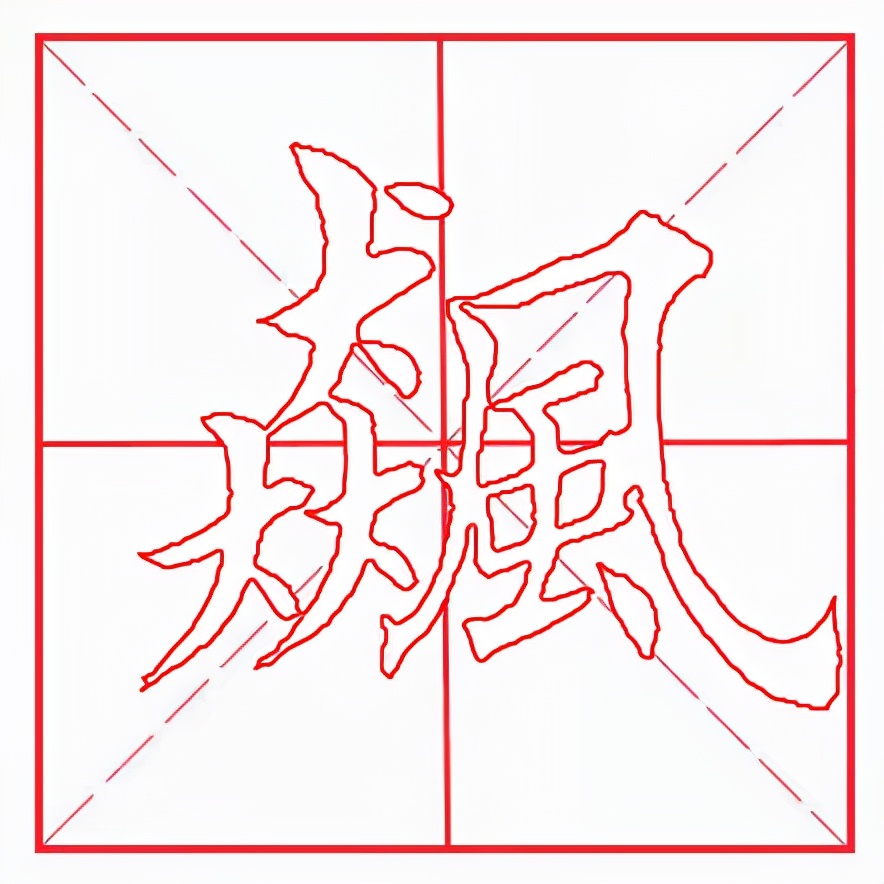 右部“风”字整体靠下,首画起笔勿远,斜切落笔后转中锋向左下行,中间略轻,注意弧度,行笔到位后略作挑钩收笔,钩身勿大;横斜钩起笔与撇画虚接,横画勿重,大抗肩,到位后先向上稍抬笔锋然后向右下顿笔,注意顿笔的角度,随即转锋向下弯行,中间略轻,弯度不宜过直或过弯,行笔到位后向上垂直挑笔出钩,内圆外方;里面小横稍上靠,抗肩圆收;“口”字形体扁宽,上宽下窄;竖笔虚接横画,稍带弯度,略带撇意,然后顺势顿笔向右上方写提,提笔勿长;最后点笔大小均匀适当,稍下坠。