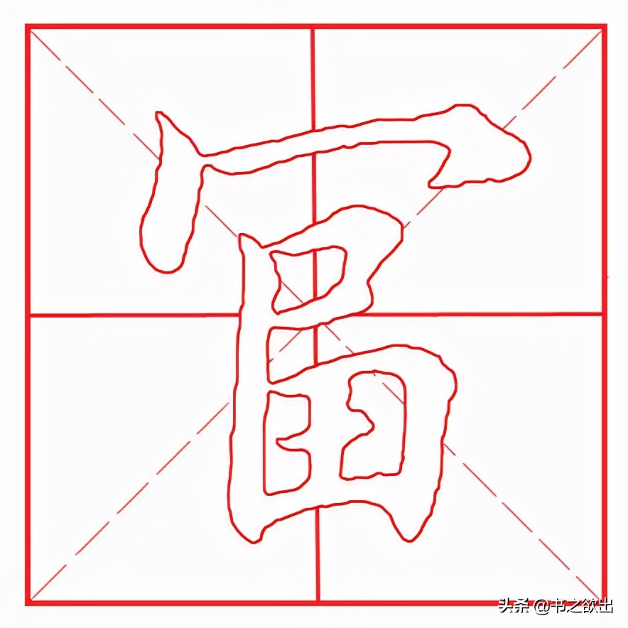上下结构,上宽下窄。首笔竖点居中,厚重,勿长,稍左斜;第二笔左竖与首点距离勿远,露锋入笔,左斜,顿收;横钩虚接起笔,横画抗肩,压着竖点下部通过,向右略轻,过竖点后右边稍长,行笔到位后向上略提笔锋然后顿笔向左下出钩,短促有力。