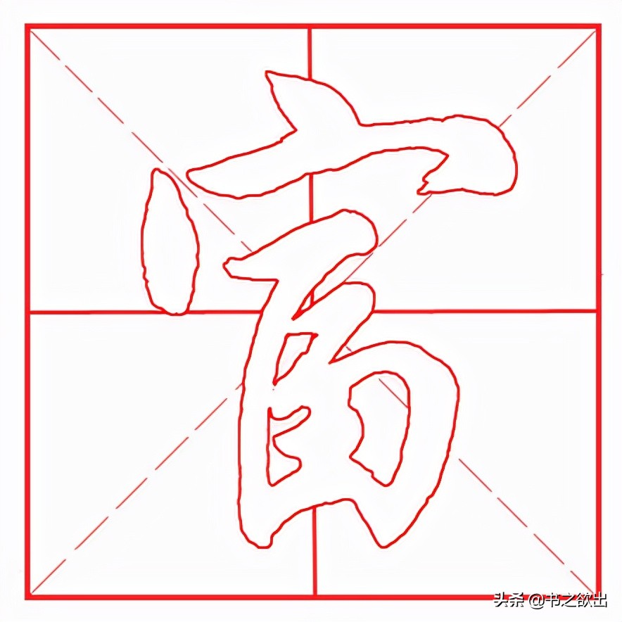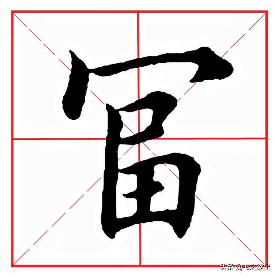 下部“畐”字诸横等距,与上部“宀”重心对应。小横位于首点正下方,起笔露锋,抗肩圆收,不要写长;“口”字整体斜势抗肩,上宽下窄,大小适中;下面“田”字左收右放,左竖起笔与横钩的起笔平齐,中竖与上部“宀”的首点对应。
