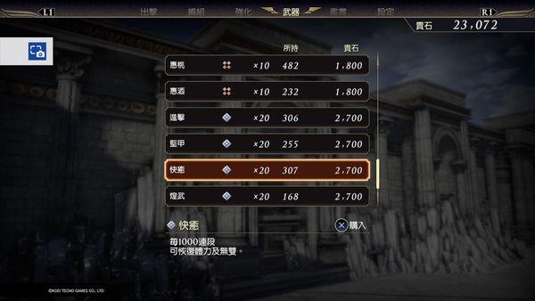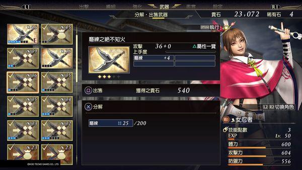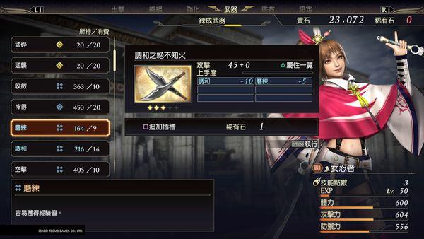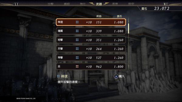 本作的武器属性也变为了购买式的。战役中破敌刷出的武器盒子只对武器基础攻击力有关键影响。武器属性是通过宝物点数购买的。宝物可通过战役破敌、武将修行、武器拆解和基地购买获得。而武器插槽则是通过花钱和稀有石来增加,这两种资源都靠战役和战场人物获得。