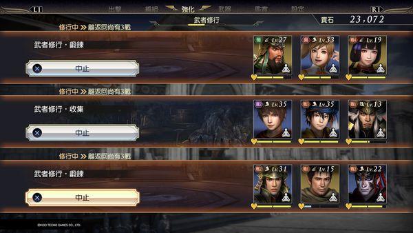 远征,或者说修行,为本作新加内容,去修行的武将在三场战役打完后回归,届时他们会升级,并带着武器和武宝物回家。这方便玩家升级自己不练的武将