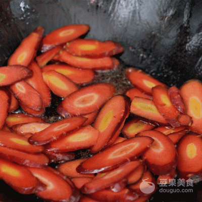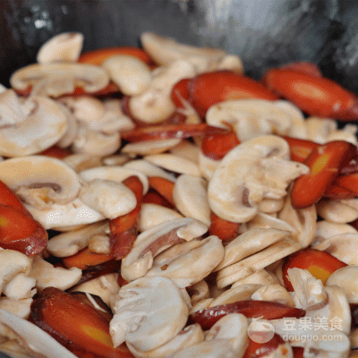 4、锅中留油,蒜片爆香后加胡萝卜和口菇炒片刻,加水焖煮至熟透。