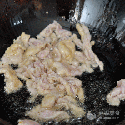 3、热锅冷油将肉片滑熟盛出。