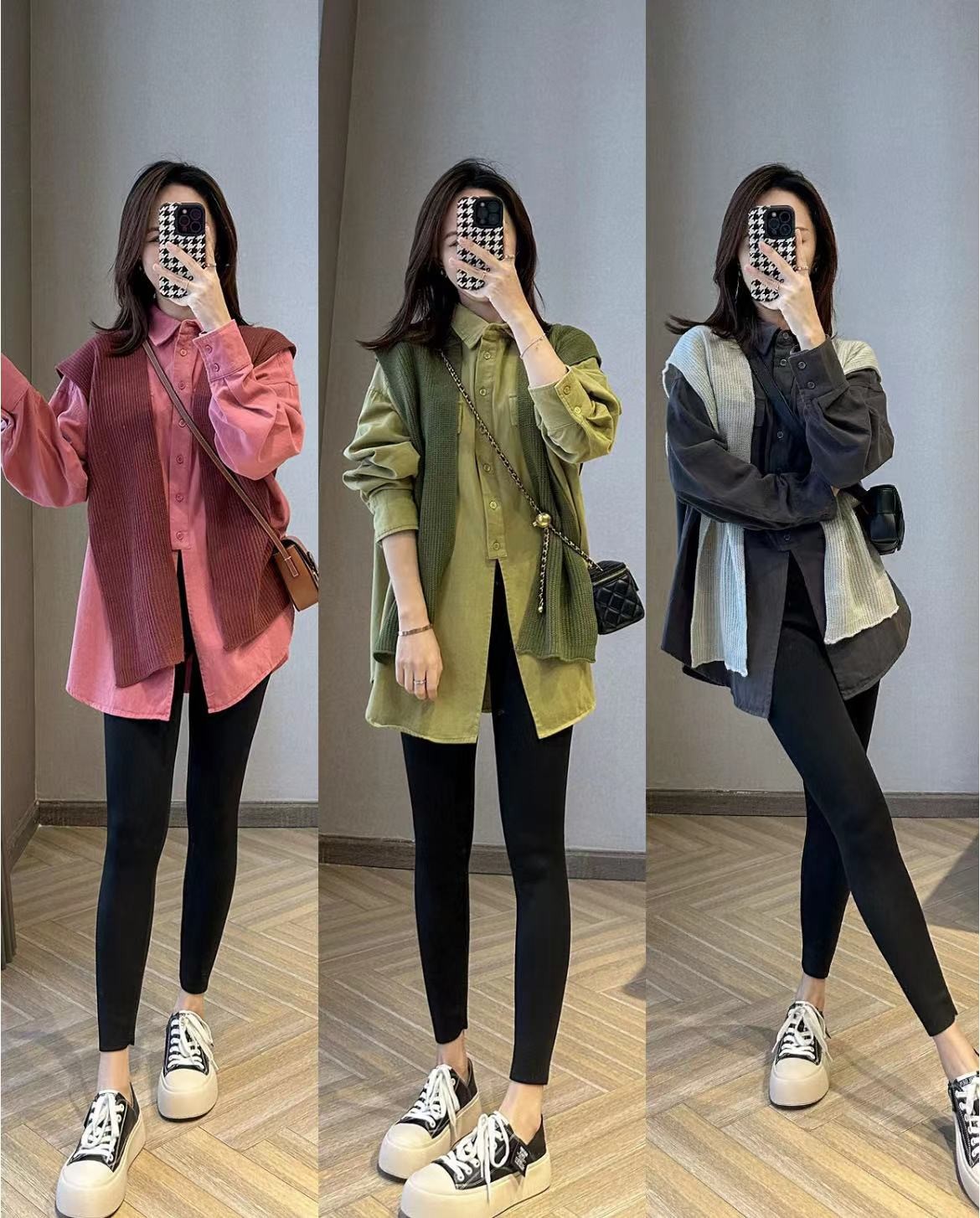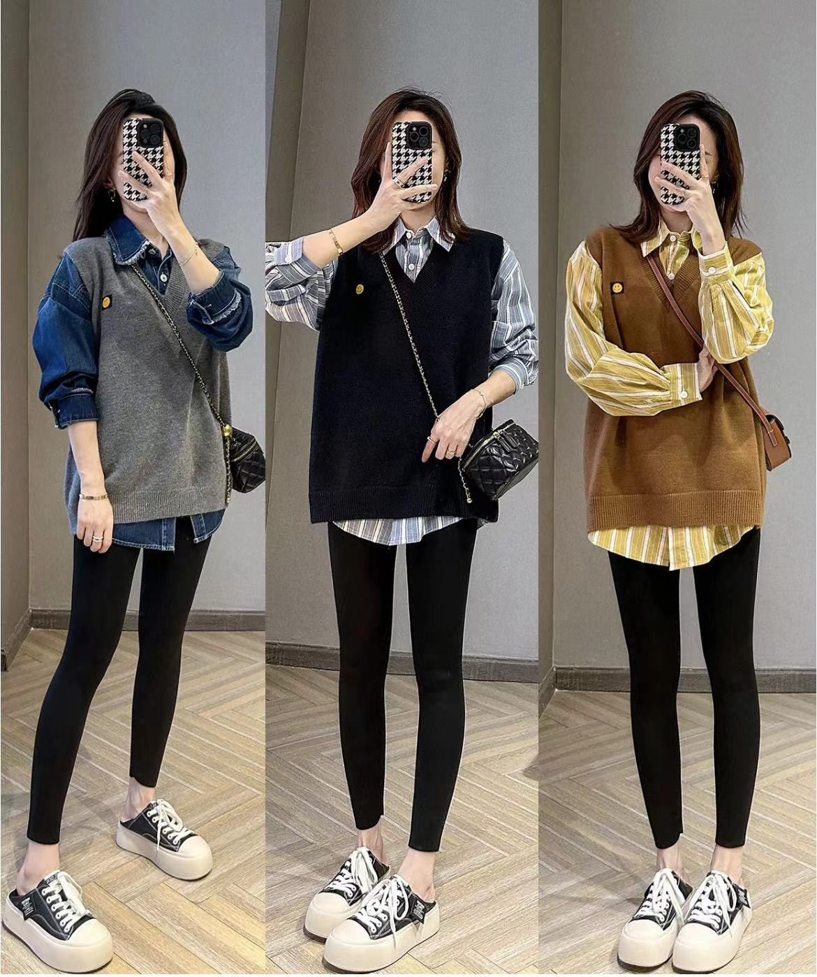 简约的纯色或者是格纹衬衫是很休闲的搭配,叠穿一件针织马甲会显得更加学院风,这样叠穿搭配不仅减龄,而且是很遮肉显瘦的。