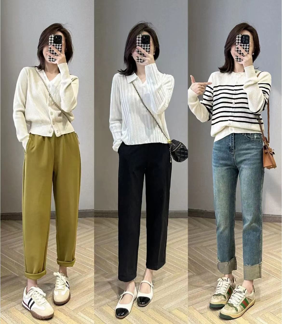 白色的直筒裤修饰腿型,而且米白色温柔又很纯净,能够很好的衬托女孩,上衣搭配卡其色的针织开衫,是休闲而又温柔的!