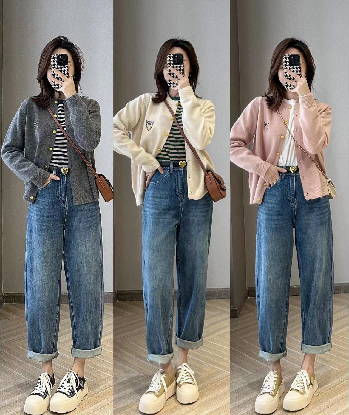 简约的针织开衫搭配复古感比较强的牛仔裤,很日常休闲的一身装扮,可以斜跨一个棕色系的小包包,看起来也别添几分可爱呢!