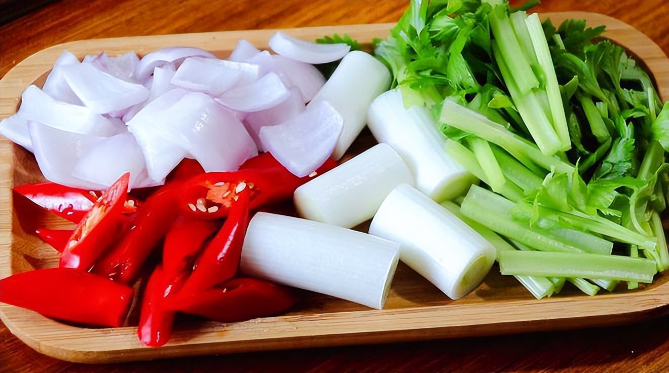 2、洋葱切成小块;红线椒切成圈圈;芹菜切成小段;大葱切成段;