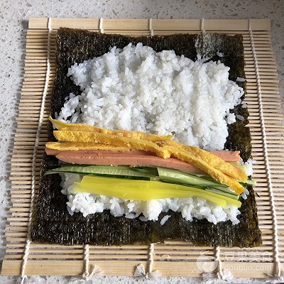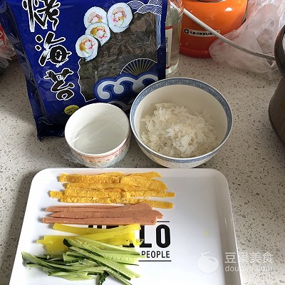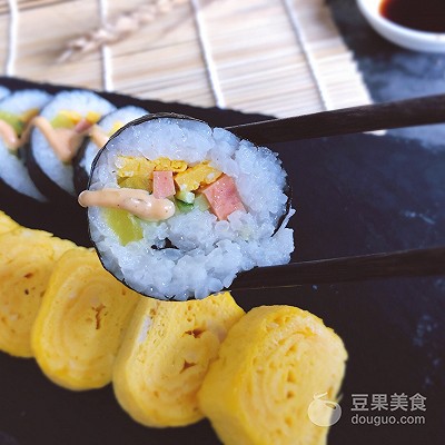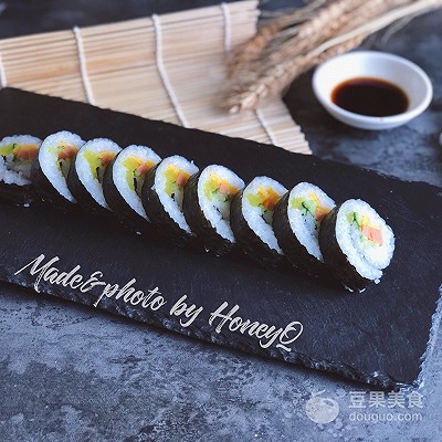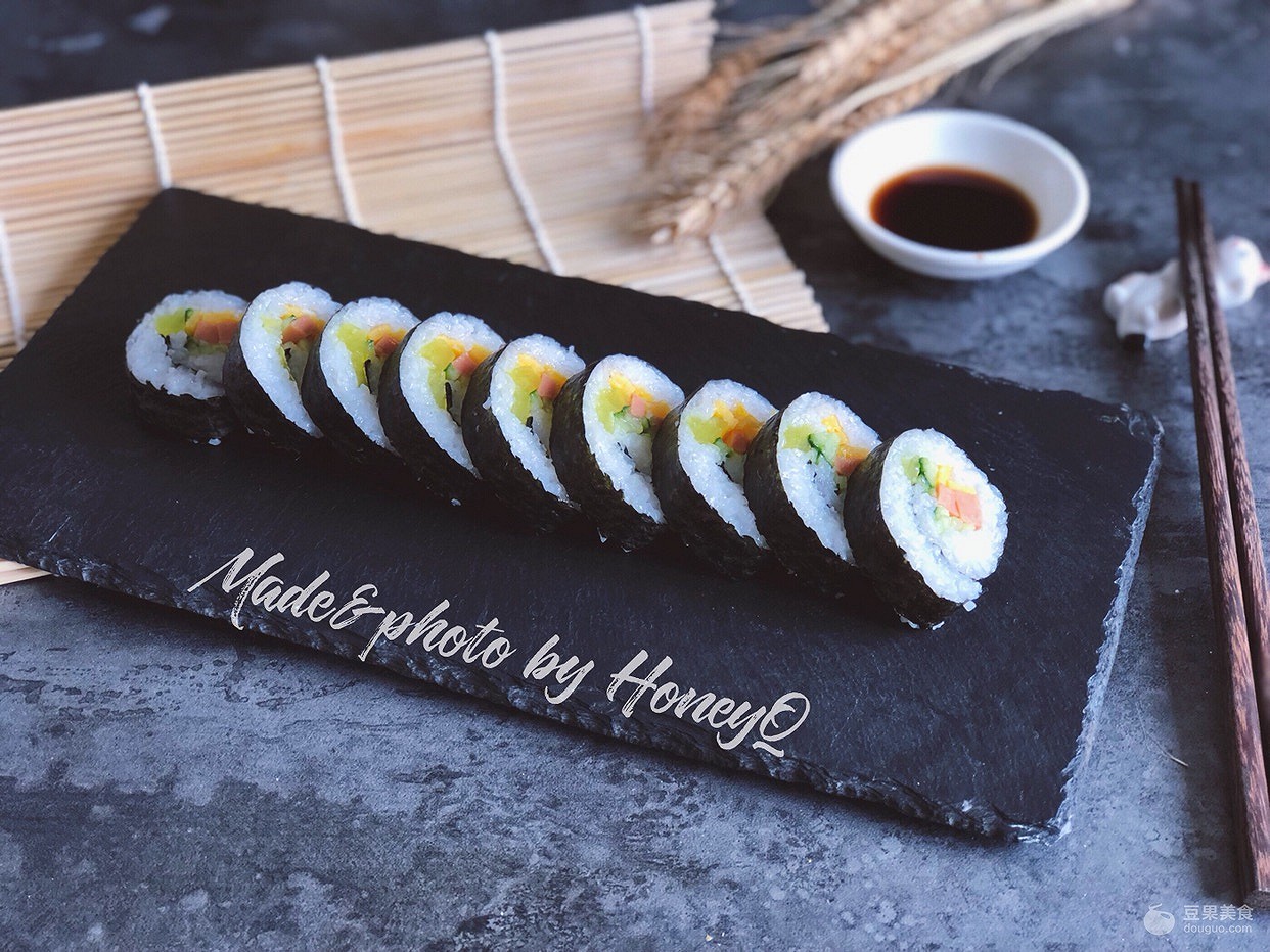 寿司,是日本传统美食之一。主要材料是用寿司醋调味过的维持在人体体温的饭块,再加上鱼肉、海鲜、蔬菜或鸡蛋等作配料,其味道鲜美,很受民众的喜爱。 现在天气越来越热,这样的一款基础寿司可以带着外出郊游,不油腻,很清爽,很适合现在这个季节做。 还等什么呀,学会了就赶紧做起来吧。 tips:此方的米饭适用于一卷寿司,也就是一人份,要增加几卷寿司,就按比例增加即可。