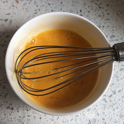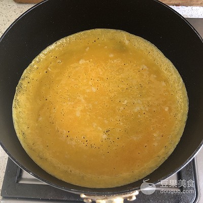 4、锅内抹一点油,小火,倒入蛋液,晃动锅,让蛋液均匀铺满,煎了一面以后翻面,凝固即可