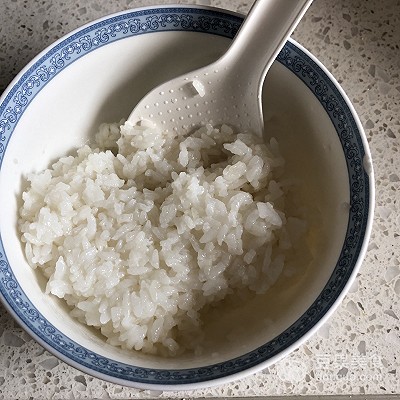 7、煮好之后焖20分钟的米饭取出放温热,加入一小勺之前最好的寿司醋,搅拌均匀