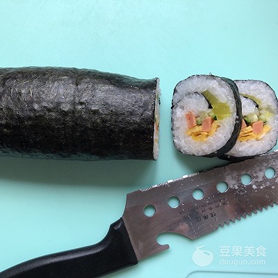 13、寿司专用刀抹一点点可以食用的清水,防粘,把寿司切片