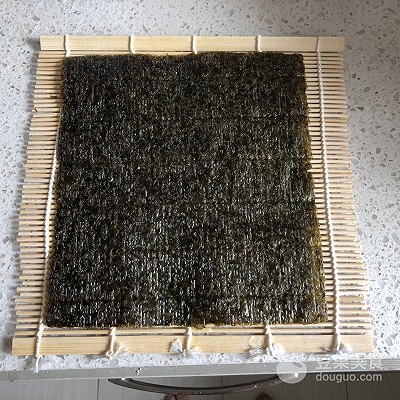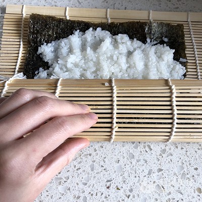 9、均匀铺上米饭,注意有一边不要铺满,不然米饭容易在卷的时候漏出来