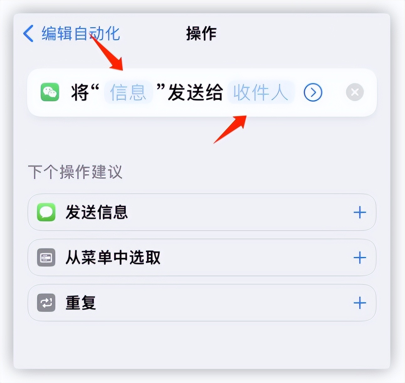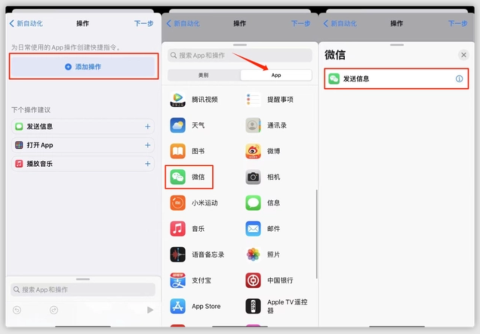 第三步,点击「添加操作」,选择「App」一栏,在下方的 App 中找到微信,接着选择「发送消息」。
