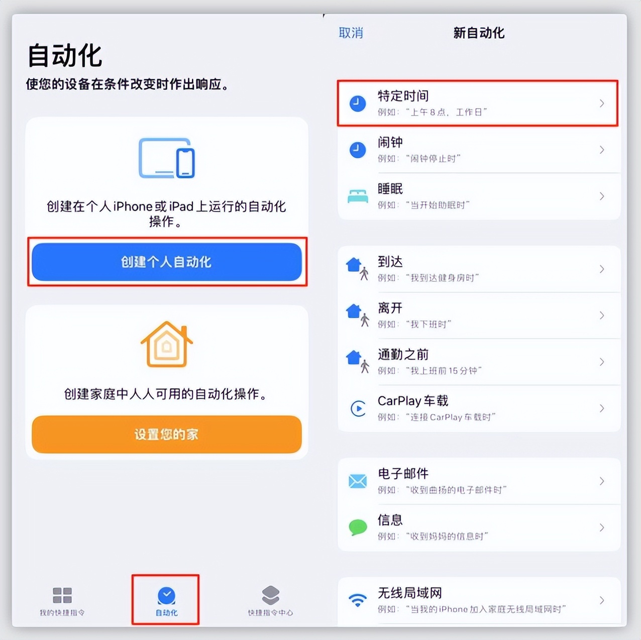 第一步,进入「快捷指令」,点击下方的「自动化」,选择「创建个人自动化」,再点击「特定时间」进入指令编辑页面。