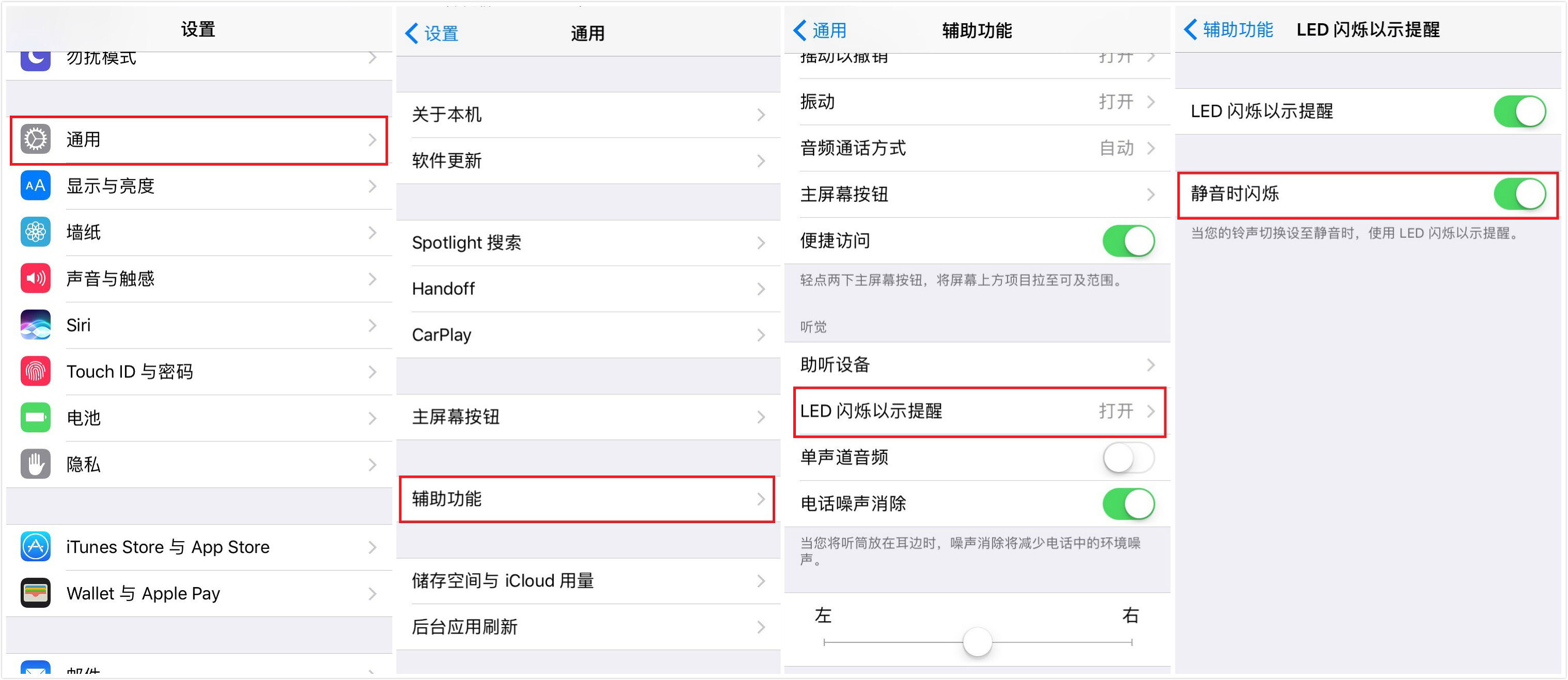 进入【设置】—【通用】—【辅助功能】—【LED灯闪烁以示提醒】打开即可