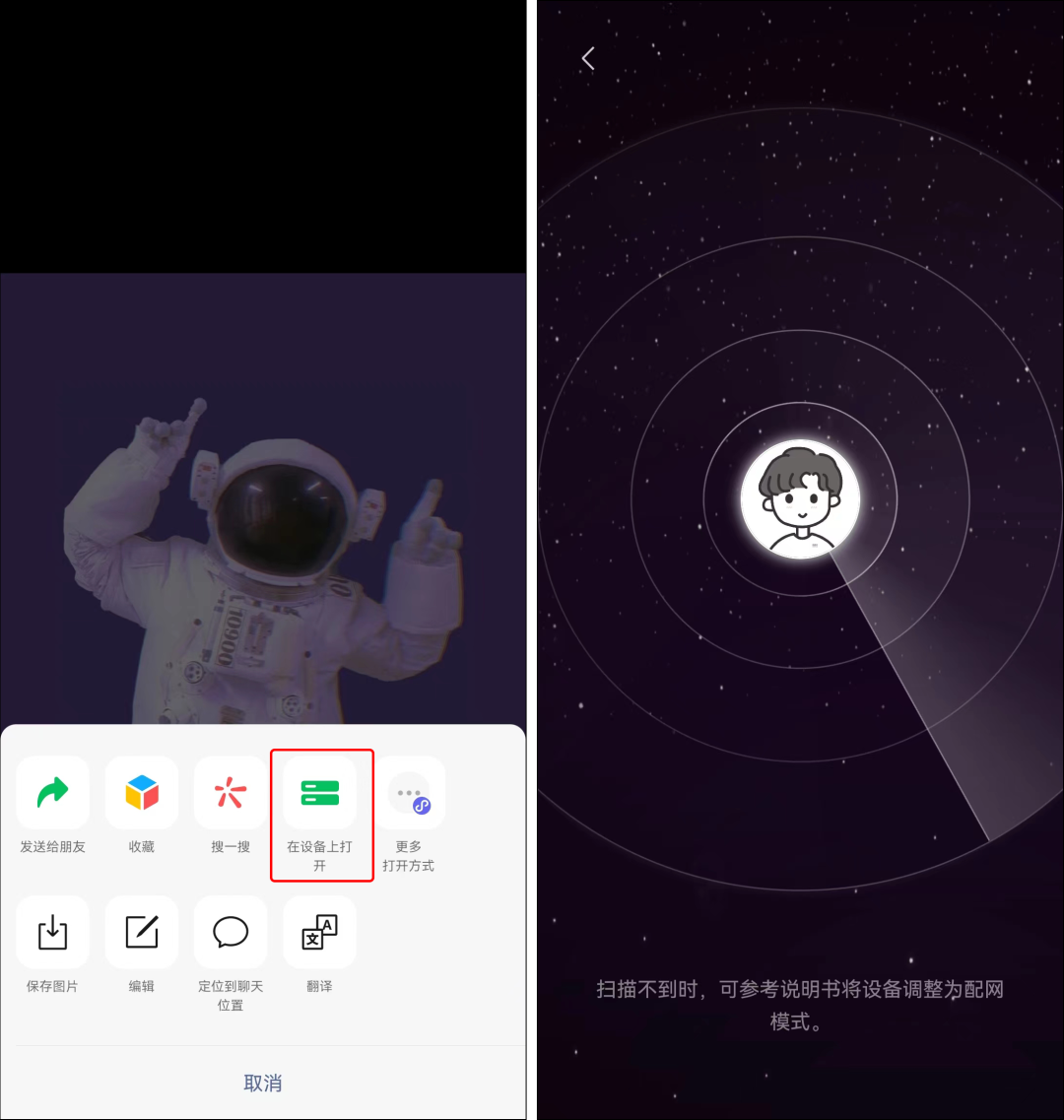在聊天中点击图片查看大图并长按时,功能栏里多了个“在设备上打开”的按钮,点击该按钮后,可以查找附近可以配对的设备。