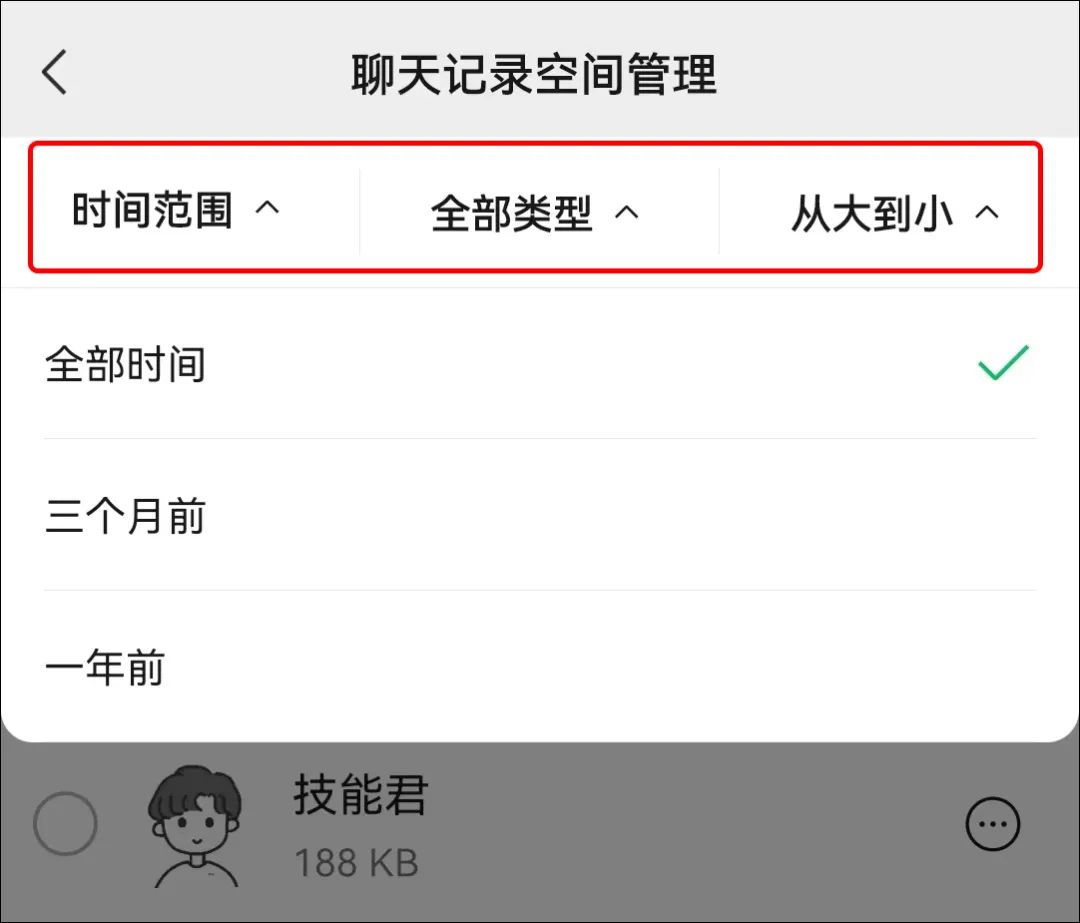 在微信“我-设置-通用-存储空间-聊天记录”中,界面顶部新增了筛选条件,可以按照聊天记录的时间范围、消息类型、排序方式进行筛选。