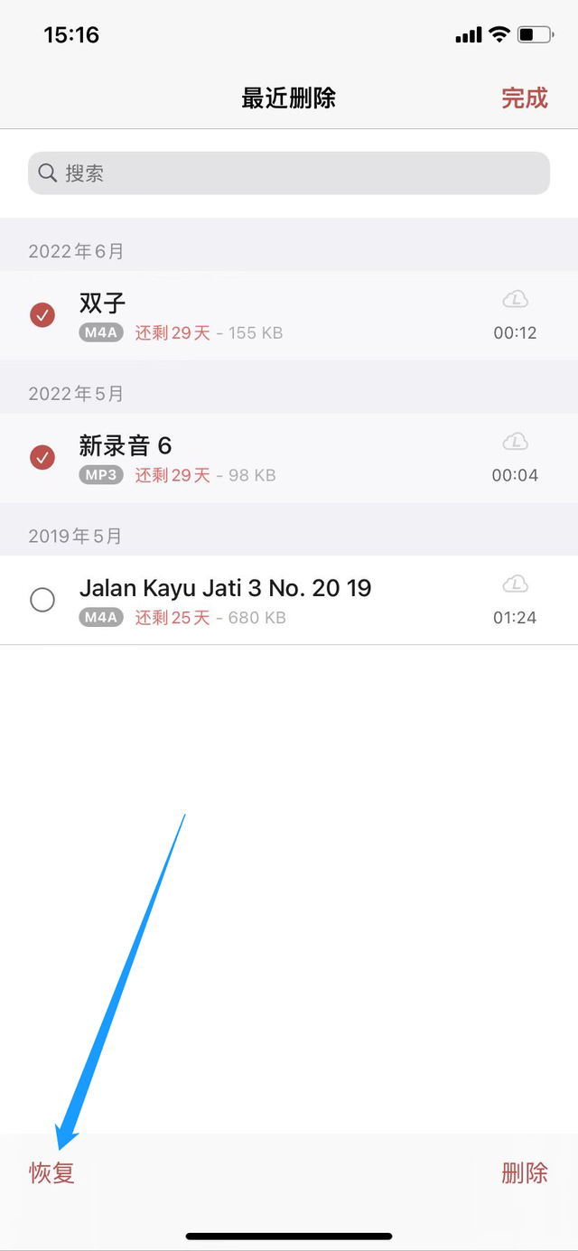 选择需要恢复的文件,点击“恢复”,再返回“录音”中即可看到误删文件已被找回(被删除的文件可以保留29天,需要在此期间操作恢复哦)。
