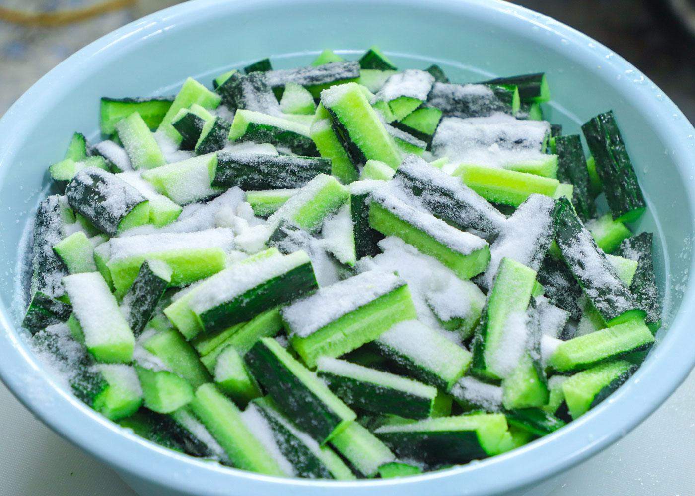 准备一个干净的盆,一定不能有油。把切好的黄瓜段放在盆里,别管腌啥菜,都得舍得放盐。咱多倒点盐,用手把黄瓜搓搓揉揉,把每一根黄瓜都照顾到。