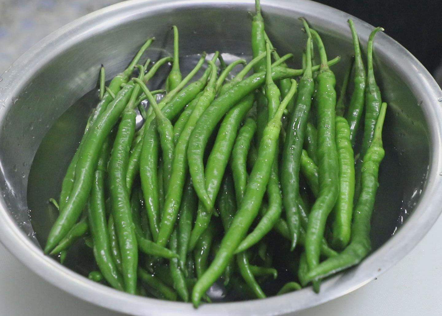 1.这里是2斤线椒,先洗干净,把老根掐掉,蒂留下。线椒中进水的话,腌制时容易变质。