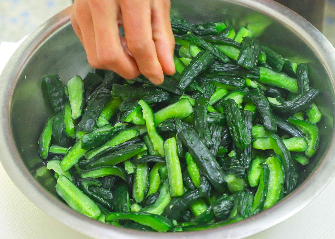 抓揉拌匀了放在一边先腌上2个小时,把黄瓜中的水分杀出来。
