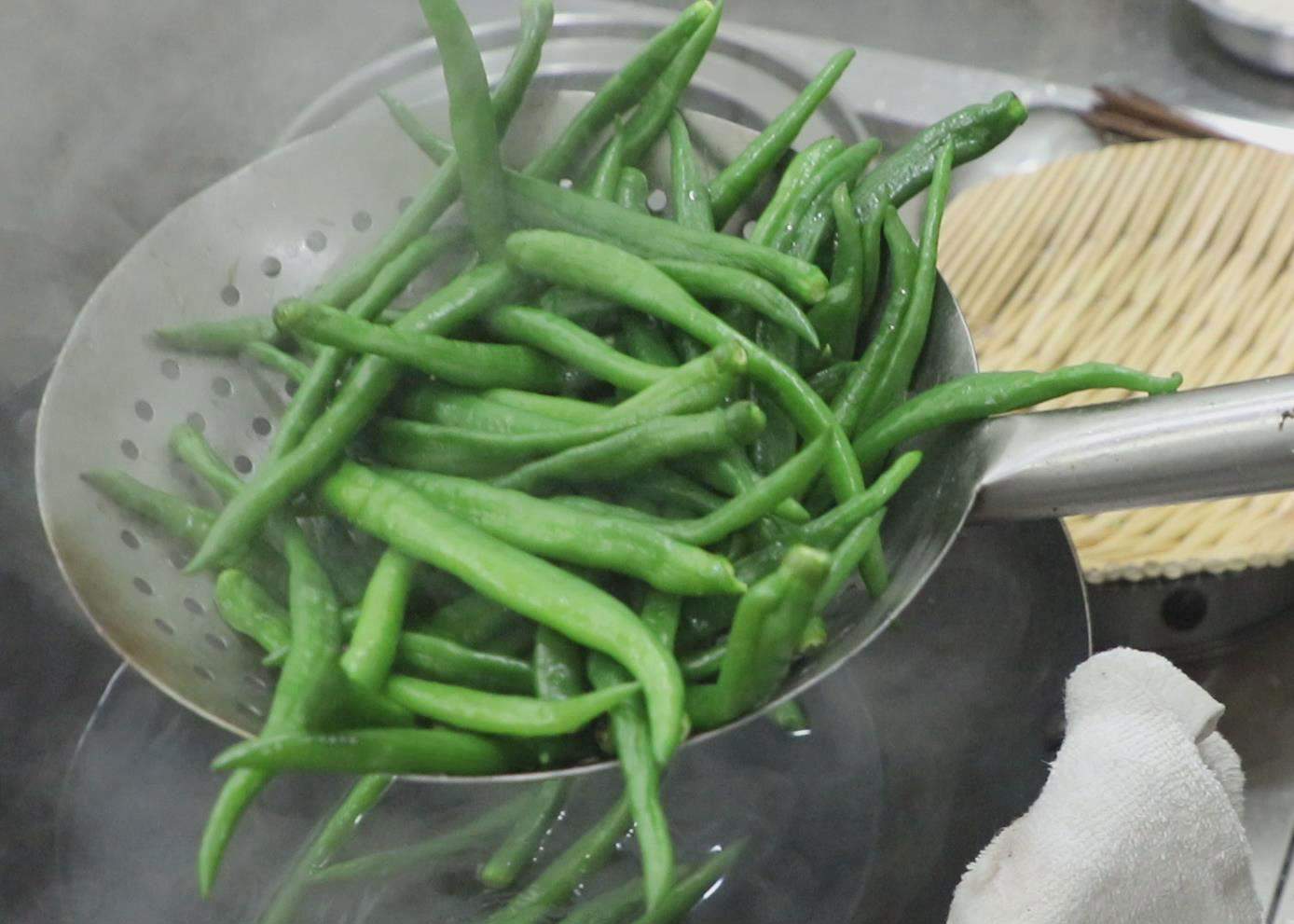 要不停地翻着线椒,把线椒煮软,表面轻微起皱时捞出晾干水分。