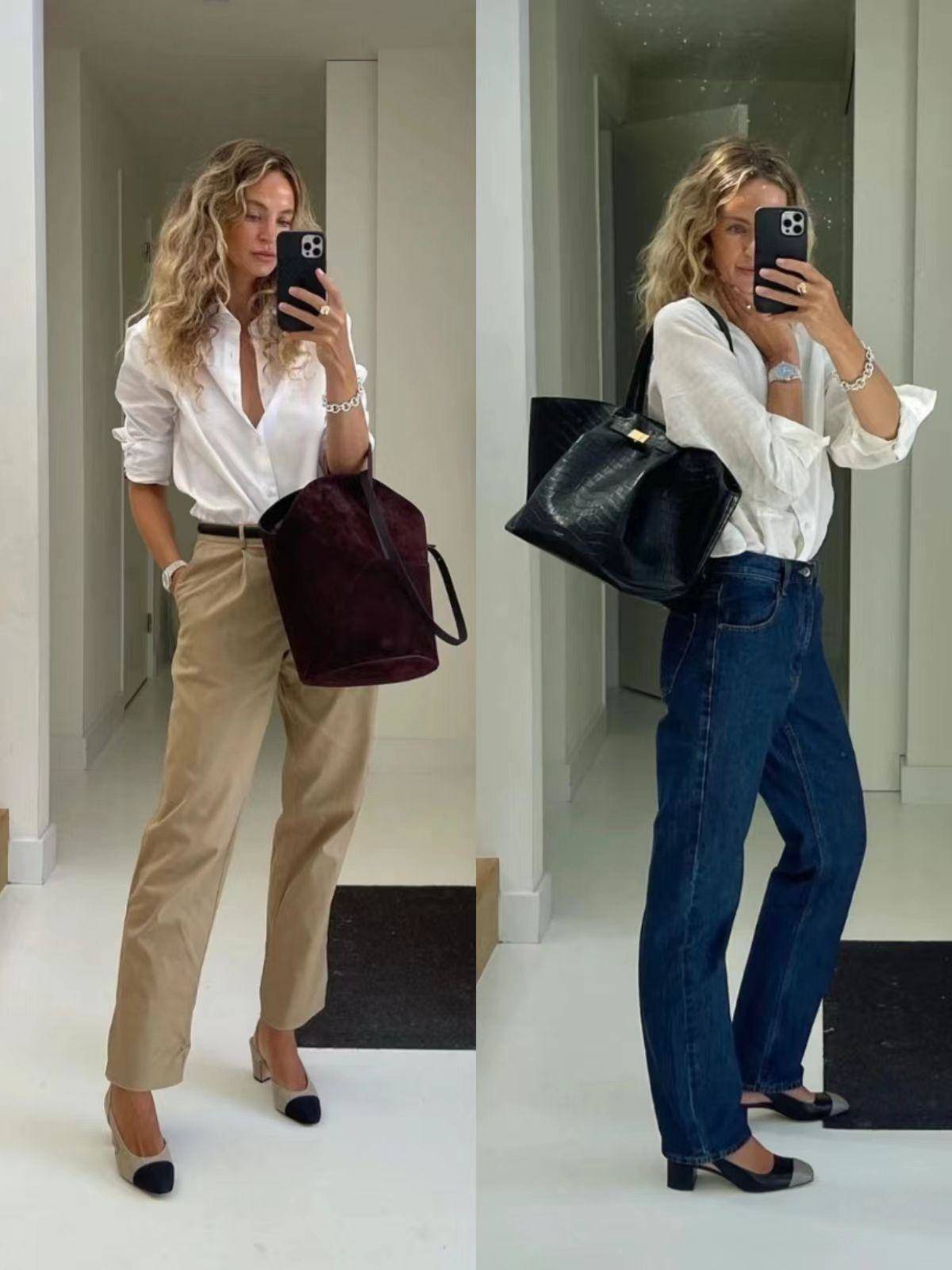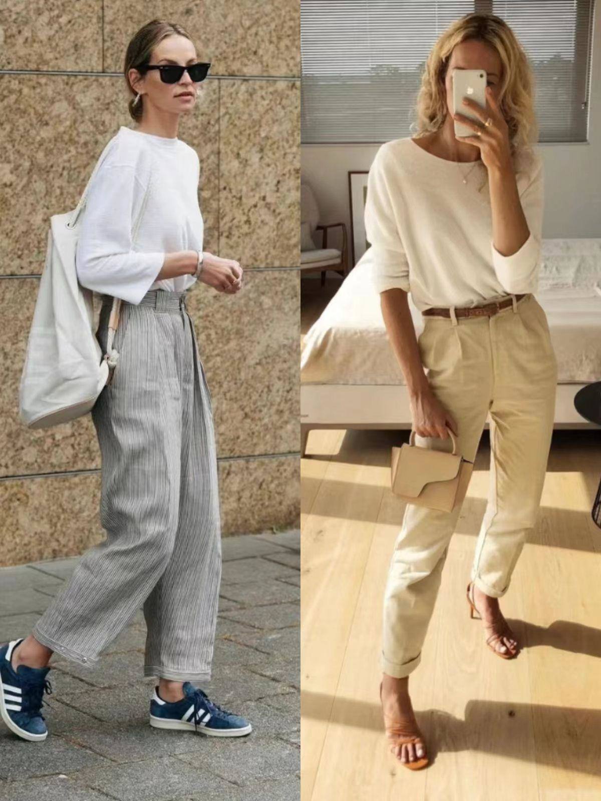 无论是白衬衫还是直筒西裤、牛仔裤,都是打造极简造型的一把好手,相互做搭配时,大家除了要打造高腰线外,还要重视一些细节。