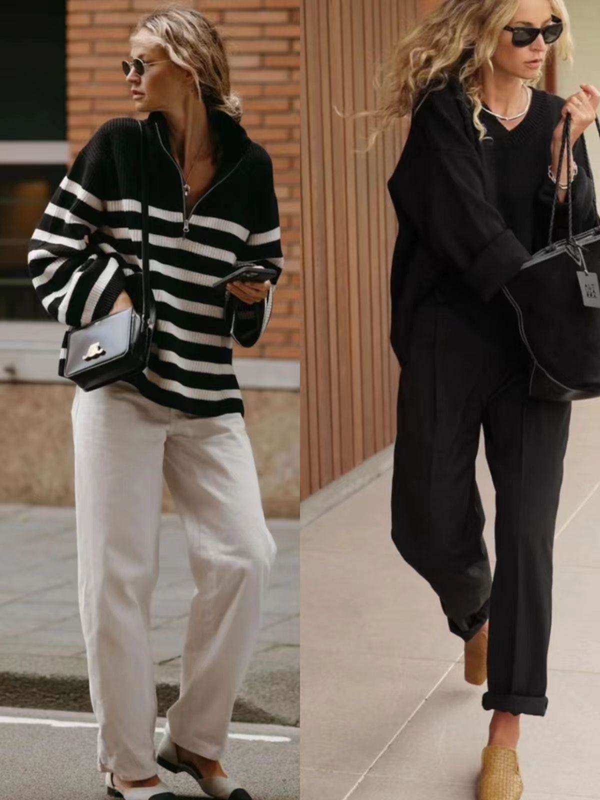 比如我们可以用宽松条纹衫匹配小直筒牛仔裤,用短外套搭配高腰阔腿西裤,松紧结合更显成熟大气。