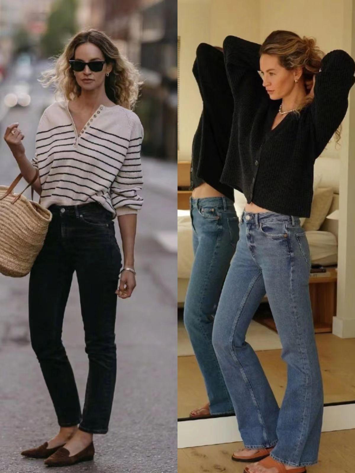 可以看到,上面这位博主的搭配简约到极致,条纹衫、直筒牛仔裤、喇叭牛仔裤,组合在一起都很干练利落。