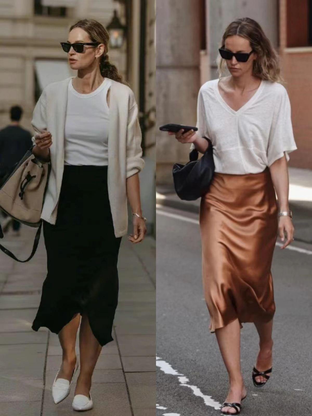 以针织衫、纯棉T恤为主的白色基础款上衣,也可以用来塑造极简look,匹配纯色半身长裙时,建议大家选择纯棉、针织或者真丝材质的裙装,增加女人味。