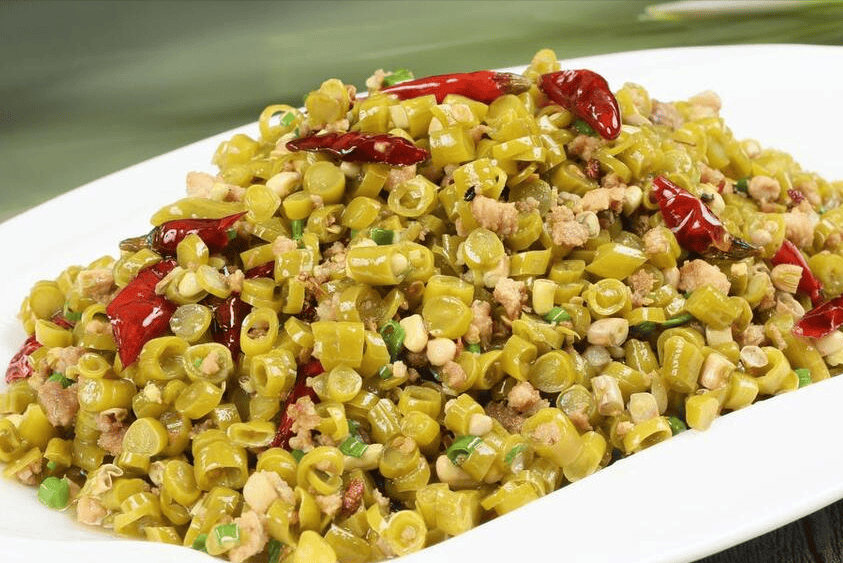 做法:酸豆角洗净切段,用开水焯水后捞出备用,热锅冷油,爆炒葱姜蒜末,加入瘦肉末煸炒至变色,加入豆角翻炒均匀,加入酱油、盐、白胡椒粉、料酒炒匀,炒熟即可。