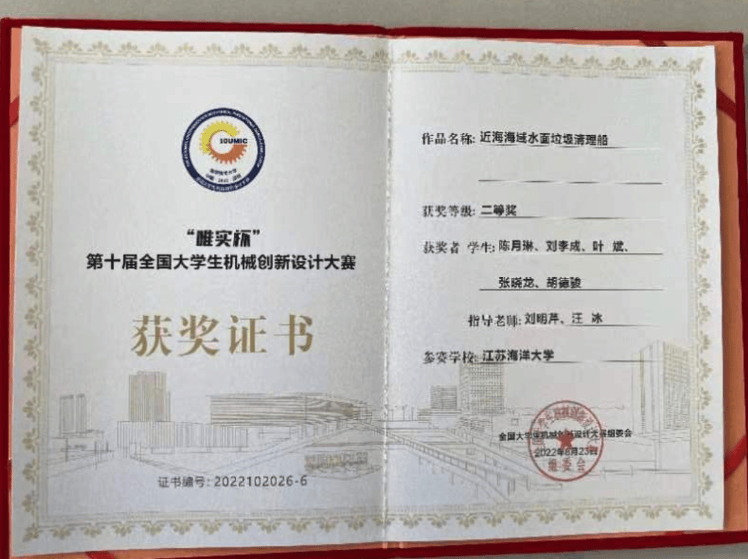 由机械工程学院刘明芹老师指导,陈月琳、刘李成、叶斌、张晓龙、胡德骏等5名本科生共同完成的作品《近海海域水面垃圾清理船》获得全国大学生机械创新设计大赛国赛二等奖。