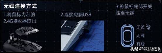 (1)将鼠标拨动至有线模式下,插上数据线,并且把 鼠标的USB-A口插上电脑USB接口