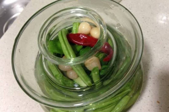 最后在瓶口封上保鲜膜,拧上盖子,放在阴凉处,等到豆角完全变色就可以食用了。