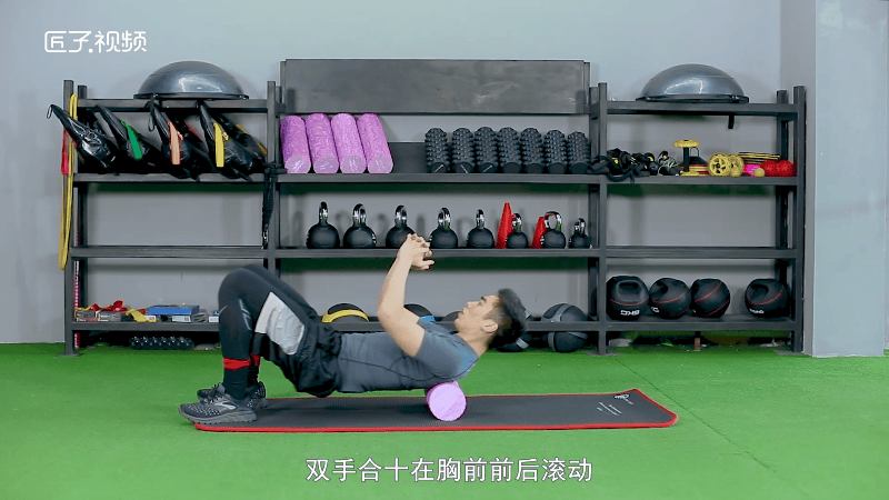 首先把泡沫轴放好,注意放到我们胸部下方,然后抬起臀部,双手合十在胸前前后滚动,上到我们肩部上方,然后下到我们胸部下方就可以了。