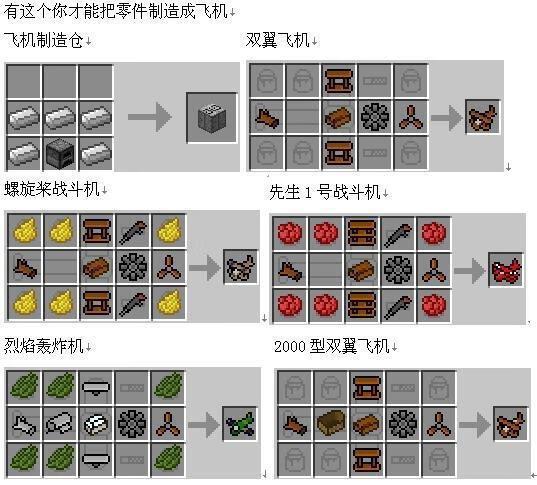 还有一个P51野马,合成表如下淡蓝 淡蓝 铁翼 机枪 淡蓝铁尾 弹仓 铁仓 V8 铁桨淡蓝 淡蓝 铁翼 机枪 淡蓝以下是重头戏:1、操纵方式w = 加速S = 减速A = 向左D = 向右Space = 向上看Left Shift = 向下看E = 离开机舱R = 库存Left Control = 射击C = 空投炸弹以上控制可以在.minecraft/config/mod_Planes.cfg中修改。这里的向左向右指的是右平移左平移(Yaw left/right),玩过飞行的会明白,不清楚进游戏试一下就是了。MOD默认关闭鼠标操控,要开启的话在cfg里把底下的Mousecontrol后面的False改True(上半部分开头加#的条目是无效的,改下半部分才有用)。但是要注意的是:鼠标操纵极其灵敏,强烈不建议开启(虽然只有鼠标操控才能控制左右滚翻[Roll left/right])在关闭鼠控的情况下,按空格机头抬高,按左Shift机头压低。你要这种飞机都还飞不起来,去下个F22 Raptor学学,真心没成本用MC里的飞机MOD教你,毕竟这里的飞机坏了是会掉材料(机翼和机翼外挂机枪无法回收······)的2、说到材料,是不是觉得很耗材料(特别是那台V8 P51···········我的铁啊············),接下来告诉你怎么改配方。放心,不是说你有一块木材就能做出P51,而是改变最终合成表中所用的部件打开.minecraft/plane,找到你要改的飞机(Mustang.txt野马的),找//Recipe,往下的便是合成部件了。比如我们要改Wings(最坑爹的部件),就找到Wings(不是//Wings那一行,那是注释),往上看一行,注释里会写有哪些部件可用。果断金属机翼改成木质双翼~~~~没事的,不影响出来飞机的外观。我也把Guns改成None了。从这个Recipe文件段也可以看出飞机可以配备任何引擎,只是影响速度而已。3、跑道要够长,至少保证30-40米,而且要有更长的缓冲区以保证在起飞降落出意外的时候能停下来而不至于撞上什么东西