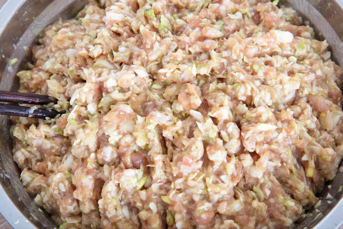 3、接下来准备肉馅,我们家喜欢吃纯瘦肉,就用了里脊肉,但是五花肉的口感其实更好。把肉洗干净之后,剁成肉末,然后再切一些葱姜末,和肉末混合在一起,接着加上生抽、香油、老抽、盐、五香粉、蚝油,将其搅拌均匀。